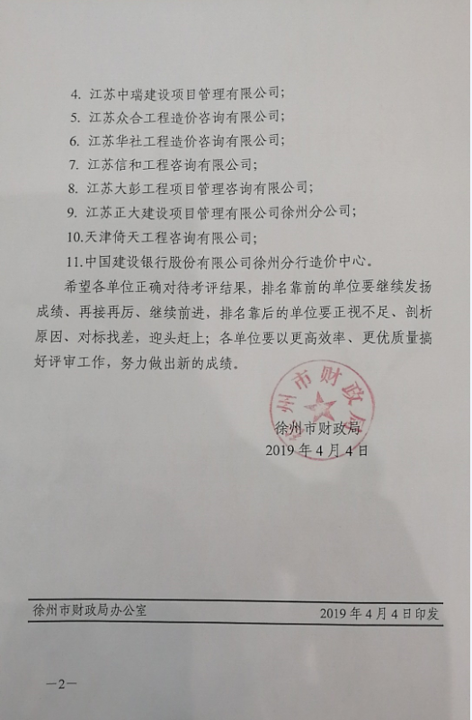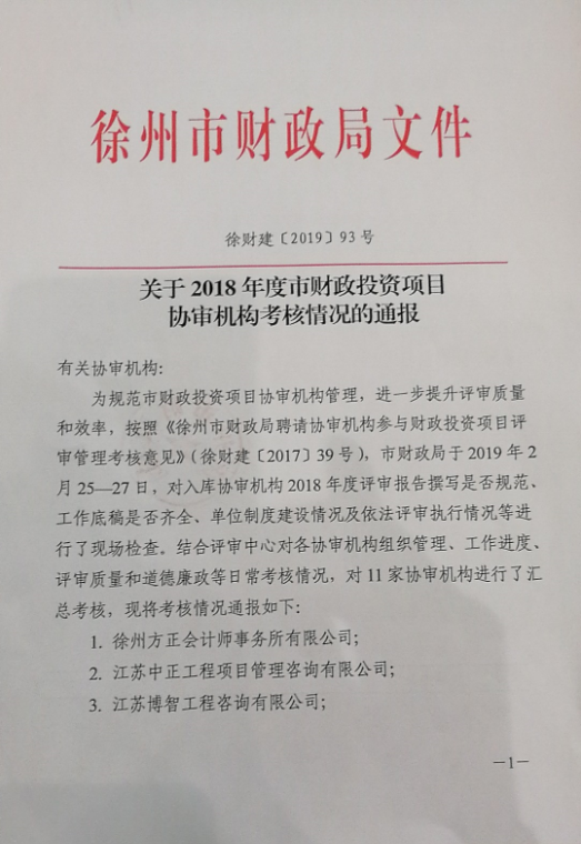 近日,由徐州市財(cái)政局組織的協(xié)審單位評(píng)比中,我所憑借自身在組織管理、工作進(jìn)度、評(píng)審質(zhì)量、道德廉政等方面的優(yōu)異表現(xiàn),榮獲本次評(píng)比第一名的好成績(jī)。